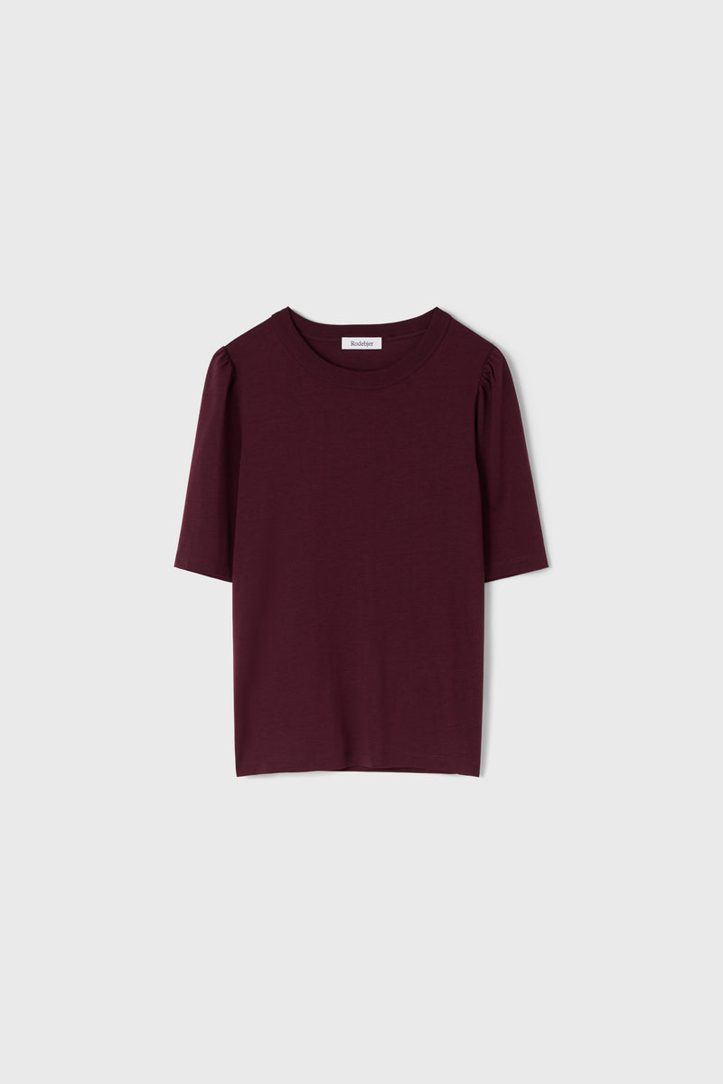This season, the Dory top is presented in a deep plum tone. Made from soft blend of cotton, it has a rounded collar and gentle gathers at the shoulders.