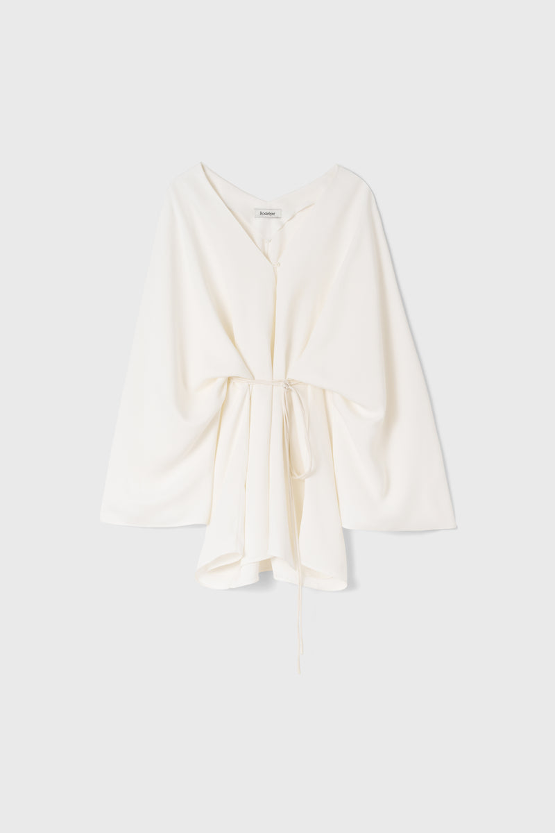 A wardrobe staple for the refined eccentric, the Glory blouse is crafted from viscose crêpe de chine with a beautiful handle and drape. Slouchy in silhouette, this long-sleeved design cinches with a thin belt with rubber-dipped ends that create a wrapped look. Extends its languid lines by pairing with wide pants and flowing skirts.
