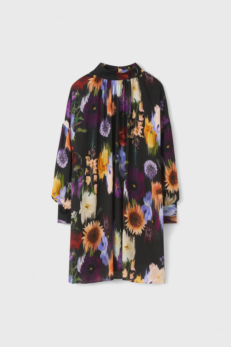 Equally romantic and flattering, the Kelly dress will bring easy-wearing elegance to any occasion. Crafted from fluid viscose crêpe de chine, it is shaped with a high collar, dropped shoulders and puffed sleeves. Falling towards its mid-thigh length in gentle folds, this piece arrives in a painterly floral print, in keeping with the season’s artistic inspirations.