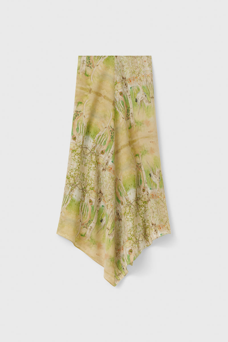 Hippie by nature and luxurious in construction, the Leianne skirt will pair perfectly with boxy knits and tailoring alike. Crafted from a blend of silk, it sits high on the waist before flowing down the figure to an asymmetrical hemline. As part of our Carl Larsson collaboration, it is illustrated with the Swedish painter’s idyllic scenery.