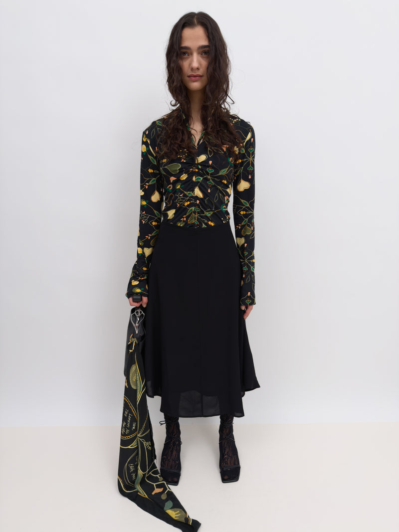 Fluid crêpe skirt with an asymmetrical hemline.